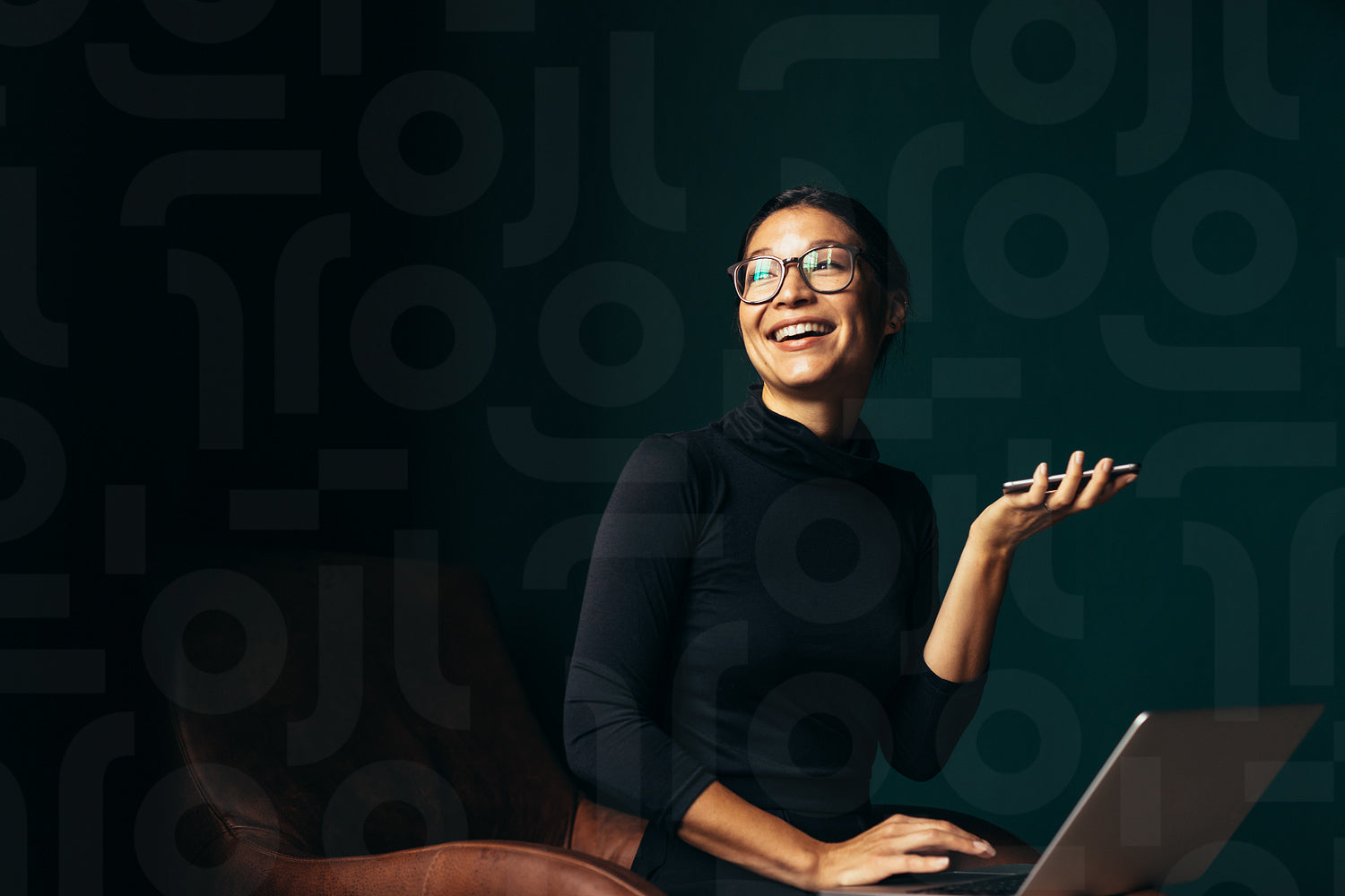 Young woman with laptop talking on speaker phone and smiling. Asian female sitting on chair with cellphone and looking away.