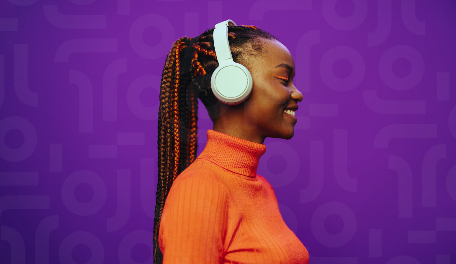 Young woman with trendy braids and purple background, listening to music with headphones