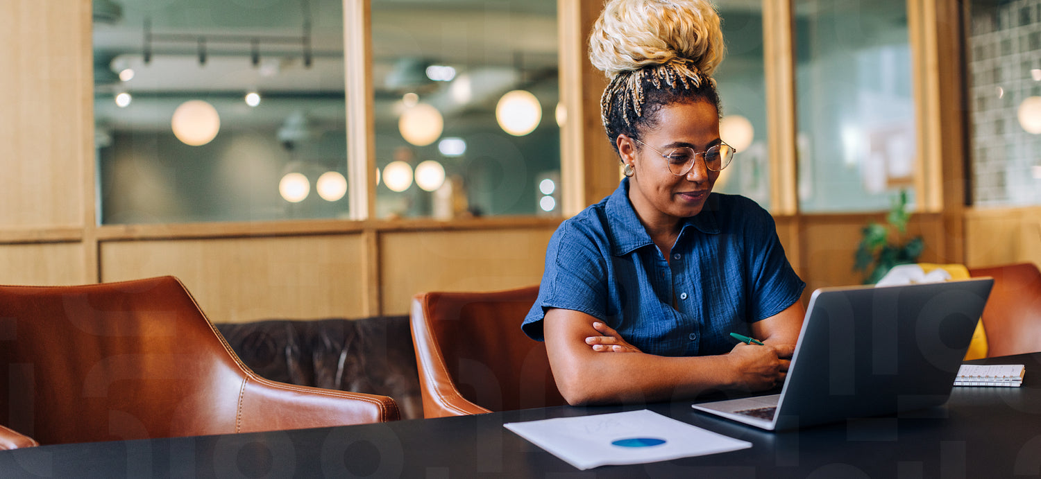 A young black woman sits at a desk, working on her laptop in a bright office space. The setting exudes professionalism and focus, with a comfortable and modern interior design atmosphere.