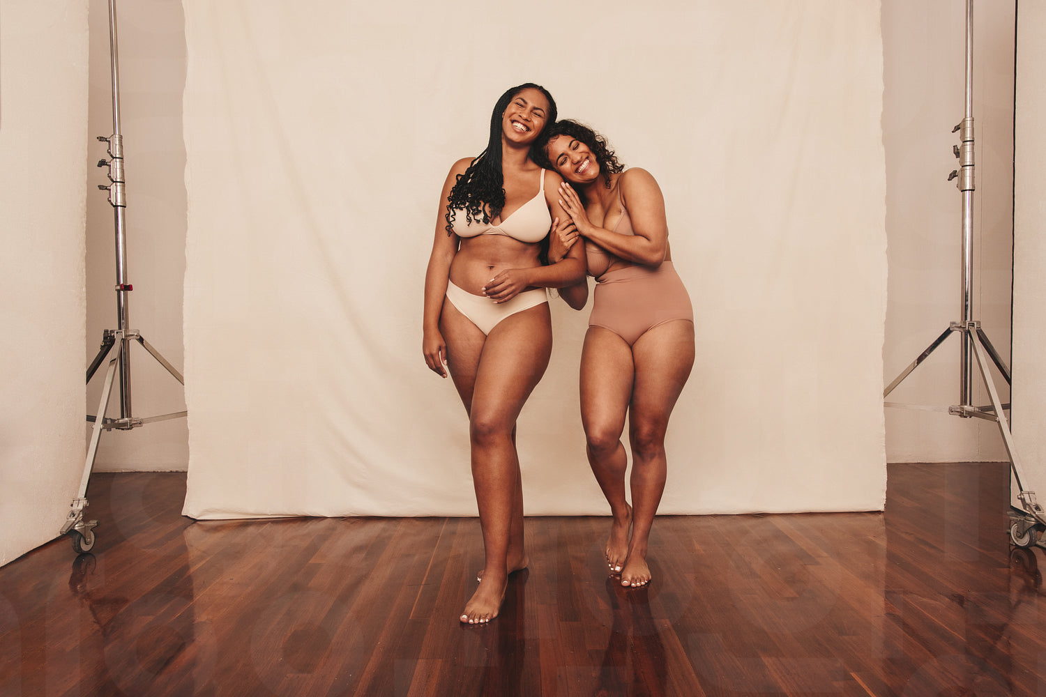 Young women embracing their natural bodies in a studio. Two happy young women smiling cheerfully while standing in underwear against a studio background. Women feeling comfortable in their bodies.