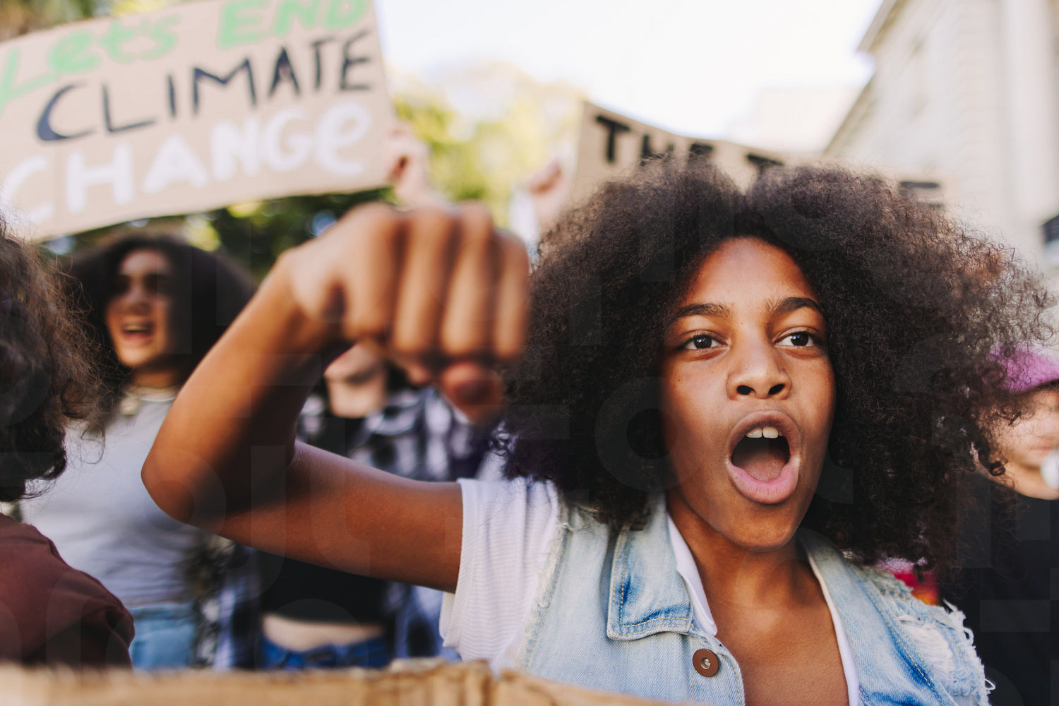 Multiethnic teenagers taking action against climate change. Group of climate activists shouting slogans while marching in the streets. Diverse young people joining the global climate strike.