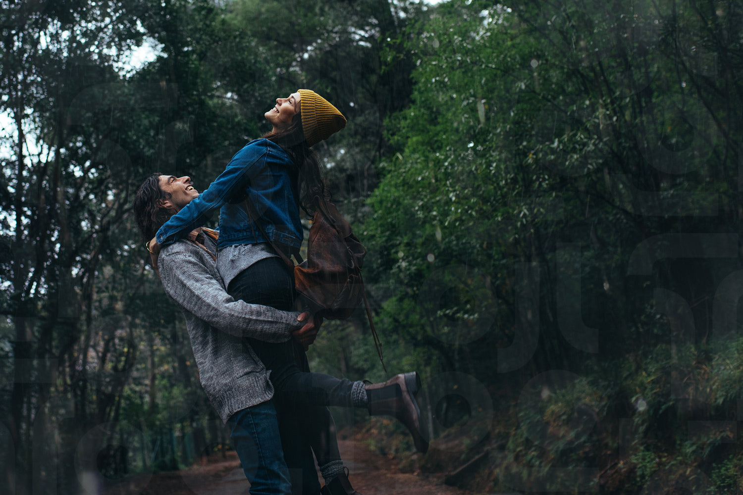 Young woman enjoying the rain with her boyfriend in a forest. Couple in the forest enjoying the rain.